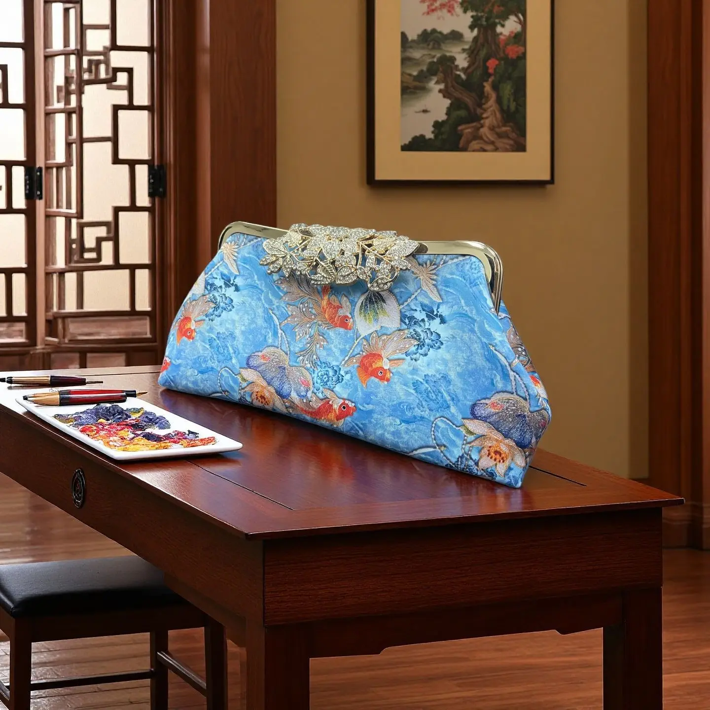 Retro Chinese Style Print Evening Bags Fine Rhinestone Inlay Clutch Handbags For Women Chain Shoulder Bag Prom Party Purse Femme
