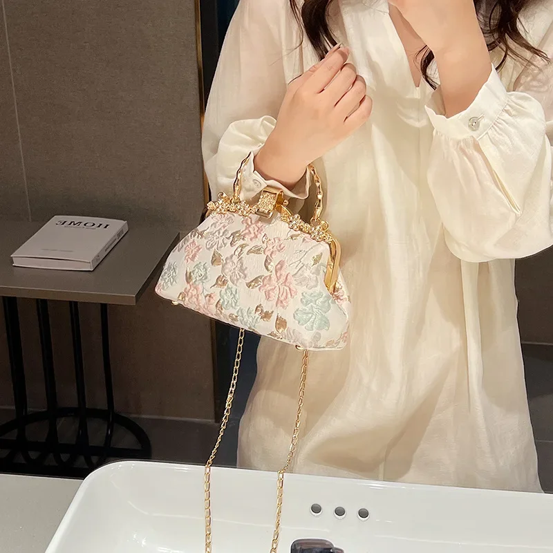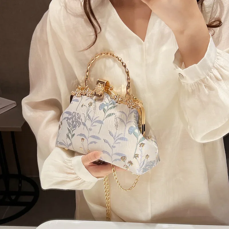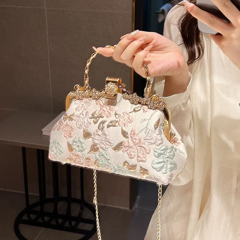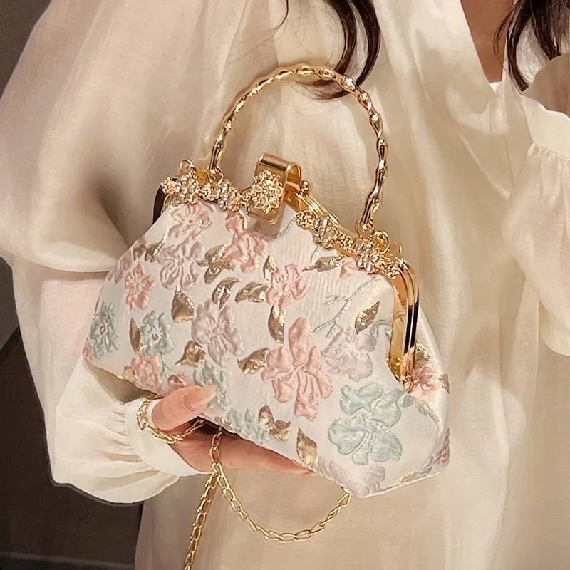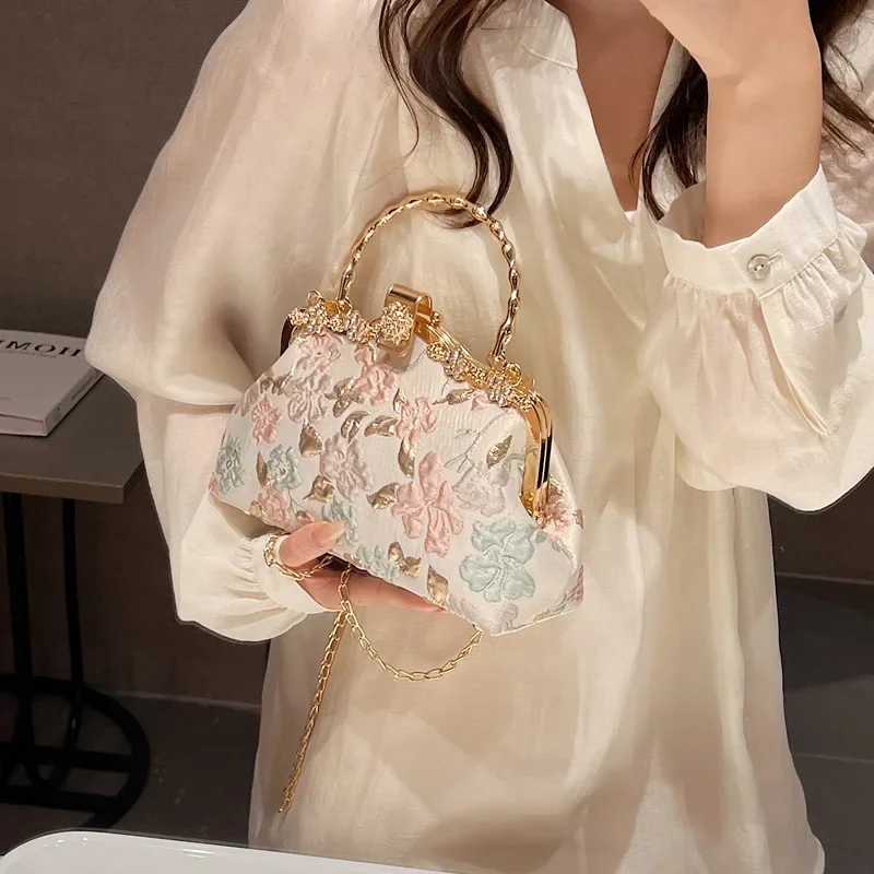 Chinese Style Flower Print Dinner Evening Bags Retro Fashion Metal Handle Handbags Banquet Party Chain Shoulder Bag Small Clutch