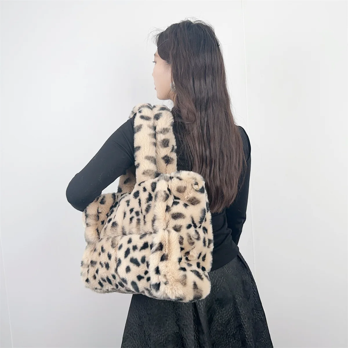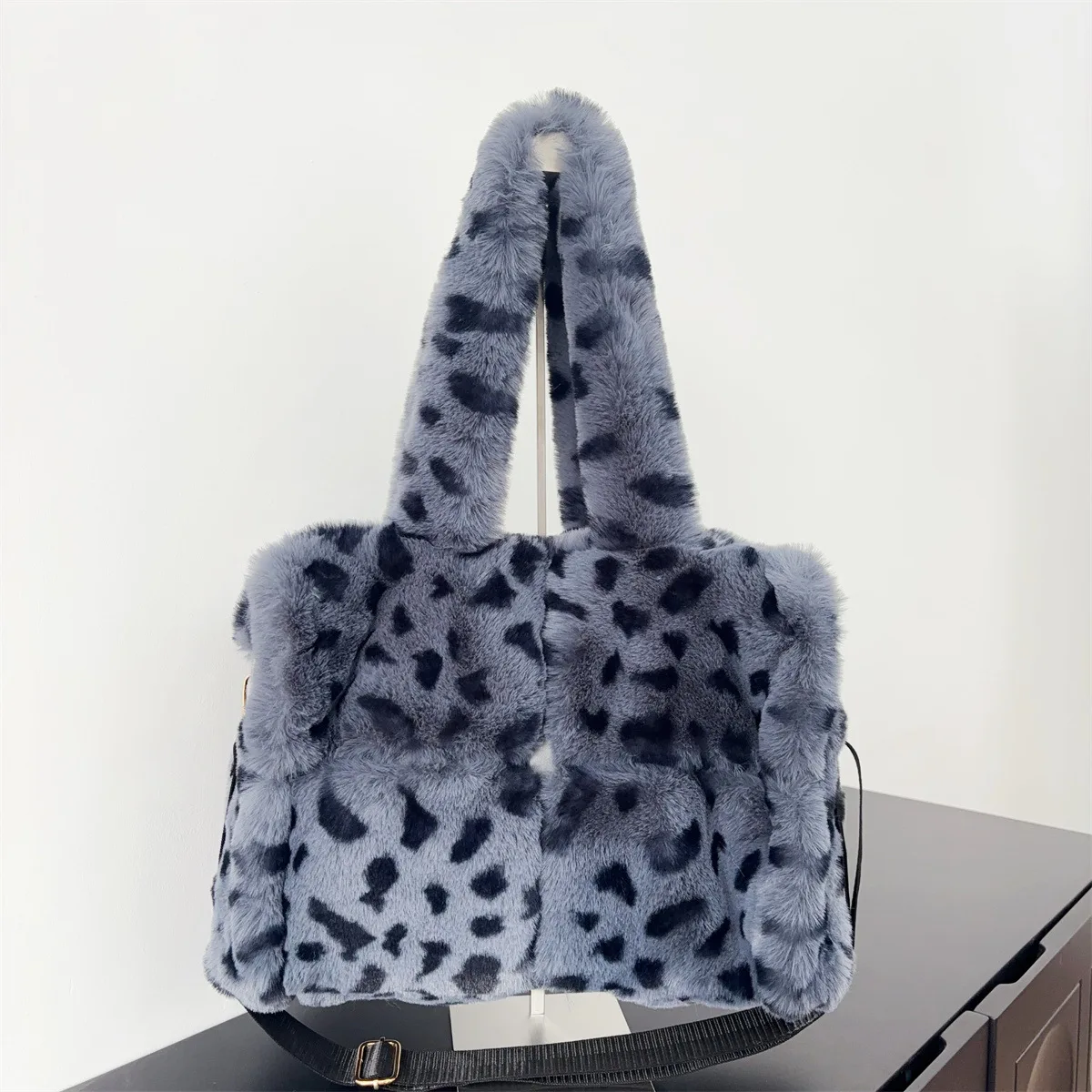 European  American Leopard Print  Plush Tote Bag Autumn Winter Vintage Gray Brown Large Capacity Shoulder Bag Handbag For Women