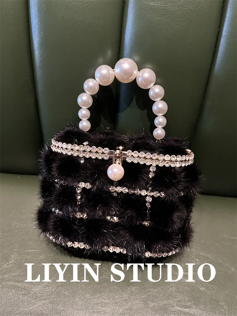 Luxury Pearl Mink Fur Bucket Bag Ladies Fashion Elegant Clutch Handbags Autumn Winter Cocktail Prom Party Evening Bags For Women