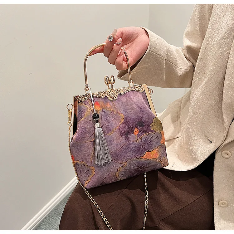Vintage Purple Green Small Evening Bags Fashion Chinese Style Leaves Print Handbag For Women Chain Shoulder Bag Crossbody Party