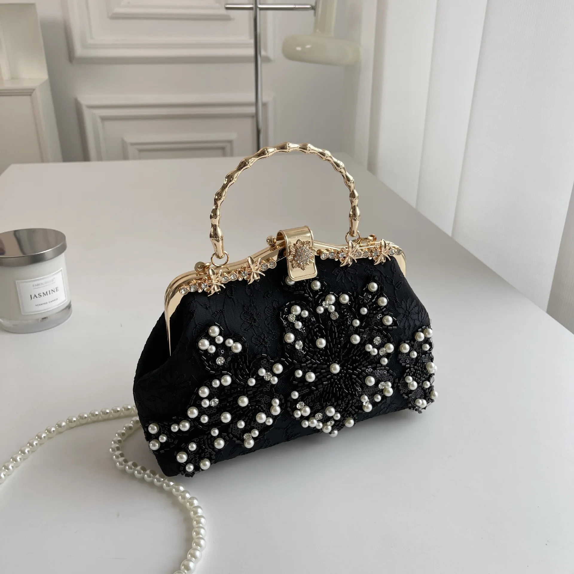 Wedding Party Women’s Clutches Fashion Pearl Beaded Embroider Flower Evening Bag With Metal Handle Handbag Chain Shoulder Bag