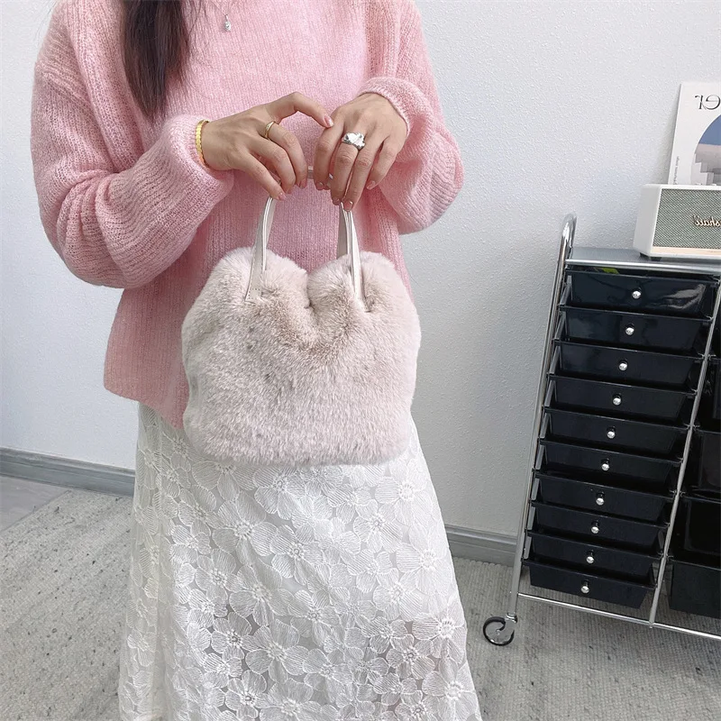 Winter Faux Fur Plush Tote Bag Fashion Large Capacity Bucket Handbag Shoulder Bag For Women Gray Pink White Daily Shopping Bag